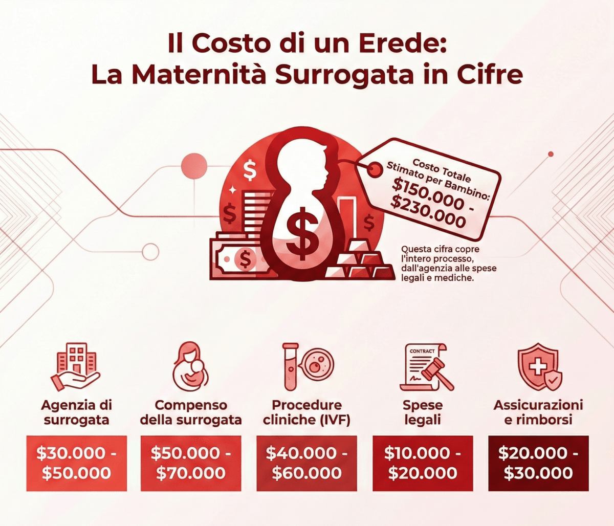 Commissionare e allevare un erede maschio in California, dall’estero (occorrenza più che quadruplicata, nel lustro appena trascorso), è a tutti gli effetti un’operazione premium, che comporta spese elevate per ogni singolo successore. Una stima dei costi medi evidenzia l’entità dell’investimento di Xu Bo, come riportato nell’infografica.