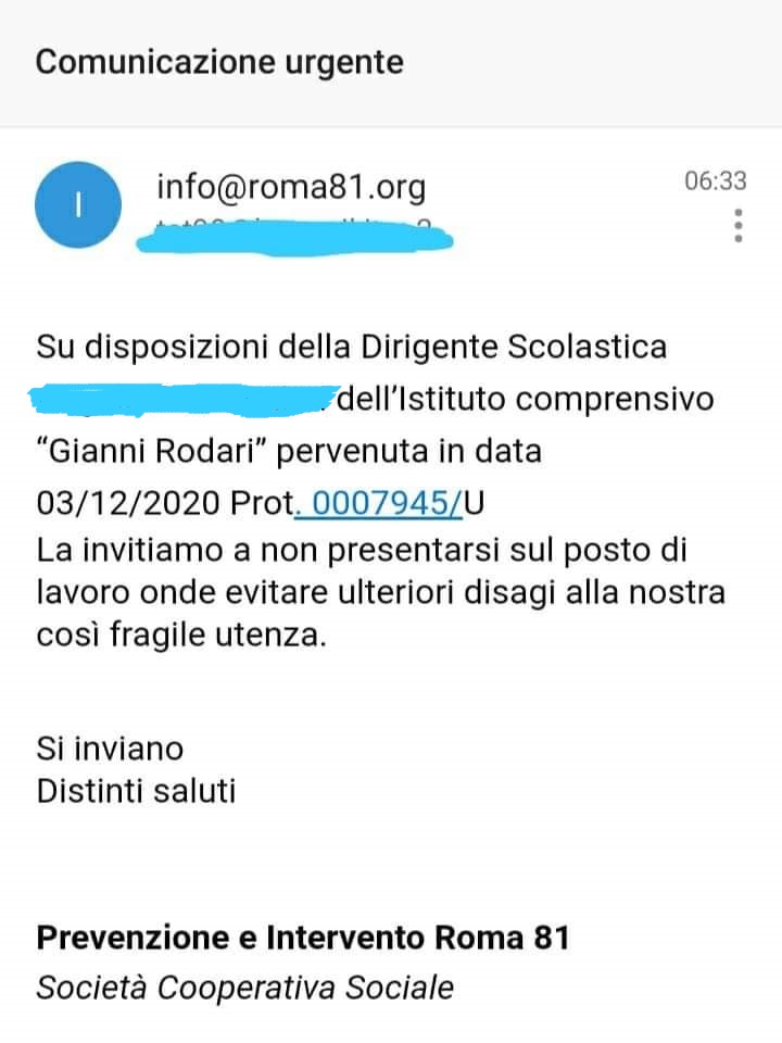 Laura e le colleghe i giorni successivi non vengono accettate a scuola: scattano delle “ferie forzate” che impediscono loro di lavorare. Verba volant, scripta manent: c’è anche una mail che attesta la situazione.