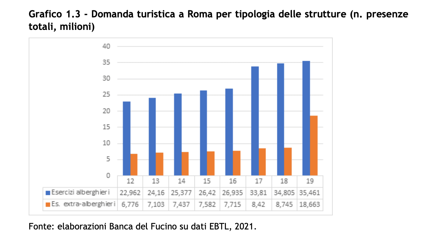 Osservando le rilevazioni di Banca del Fucino sui dati EBTL risalenti al 2021, infatti, emerge che dal 2018 al 2019 le presenze turistiche nelle strutture extra-alberghiere hanno fatto un balzo enorme, passando da 8,7 milioni a 18,6 milioni.